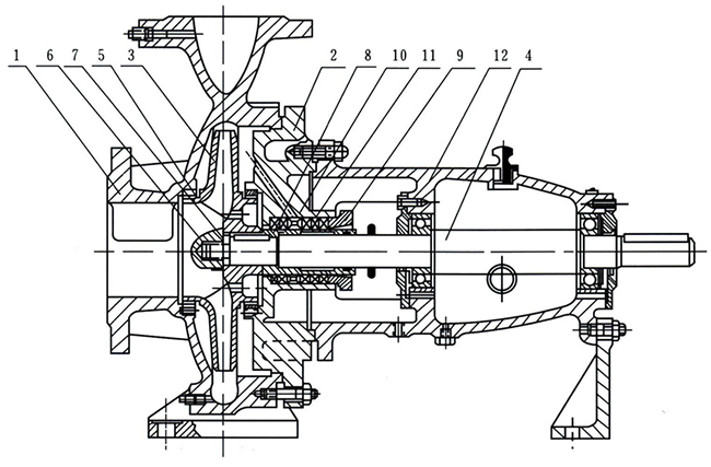 IS、IR型臥式單級單吸清水離心泵為后開式,拆開泵蓋和葉輪時不需拆卸吸水和排出管路。懸架內(nèi)裝有兩個滾珠軸承,用機(jī)器油或潤滑脂潤滑。泵通過彈性聯(lián)軸器由電動機(jī)直接驅(qū)動。渦室、腳、進(jìn)水法蘭和出水法蘭鑄成一個整體。